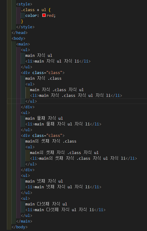 한번 해보는 게 편하다. .class + ul 하면 .class의 형제 하나만 선택한다 했다. 그럼 뭐가 선택되냐 .class가 2개니까 둘째 자식 ul과 넷째 자식 ul이 선택된다.